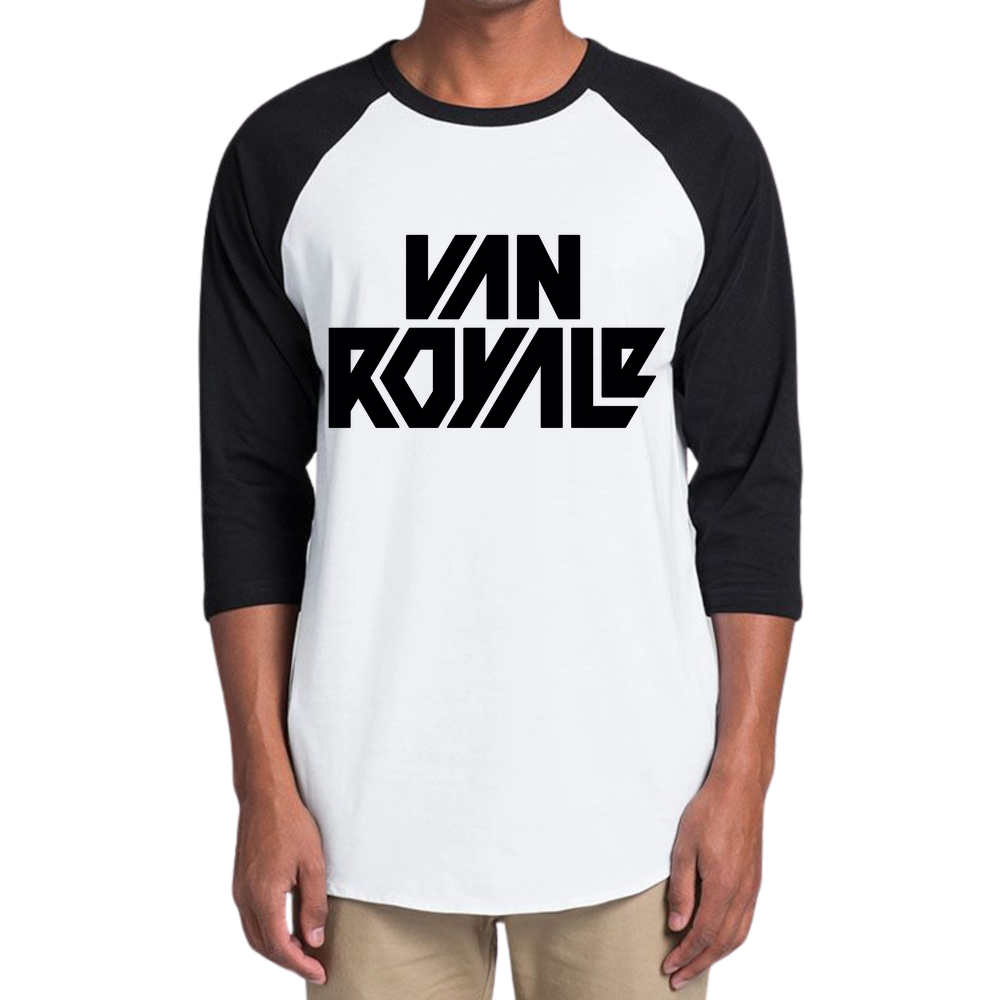 The Van Royale Logo printed in black on a Raglan white and black 3/4 sleeve cotton t-shirt.